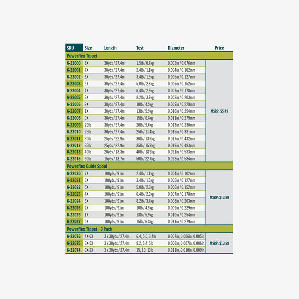 RIO Powerflex Tippet is a high knot strength copolymer nylon tippet that features superb knot strength, stretch and suppleness to make this an excellent nylon tippet material for almost all trout fly fishing needs. It is a light grey color to enhance its camouflage ability on the water, and is available from 8X to 50lb.