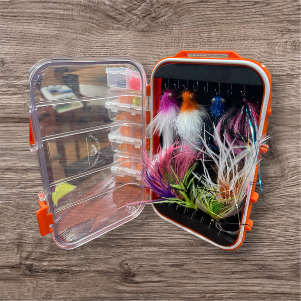 An excellent collection of CRO hand-picked swinging flies to match all river conditions and seasons when chasing steelhead and salmon. Single stage intruders and leech patterns are subject to slight variation from the posted image. Includes CRO fly box with 8 streamers, 4 single stage intruders and 4 leeches.