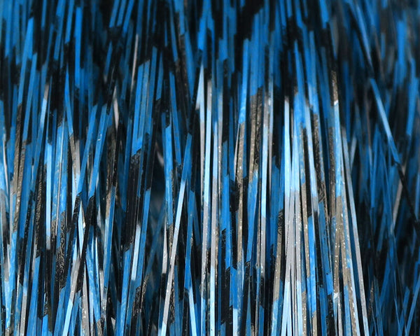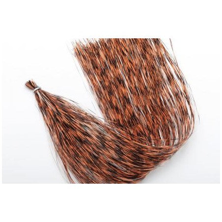 Transparent colors with a black bar. An excellent synthetic alternative for the expensive grizzly feather. Contains approximately 1,250 strands, 1/69” wide by 10” long.
