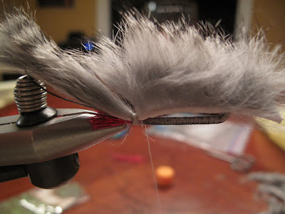 Tie in Chinchilla rabbit strip in front of red ice dub. Tail should not extend past fireline.