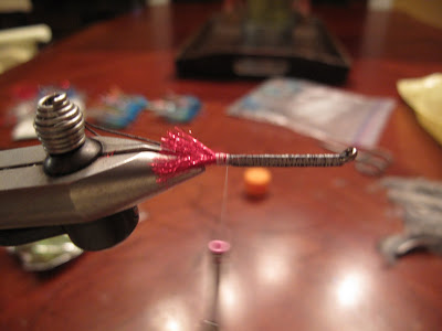Tie in at the middle small clump of red ice dub along inside edge of hook just on front of fireline.