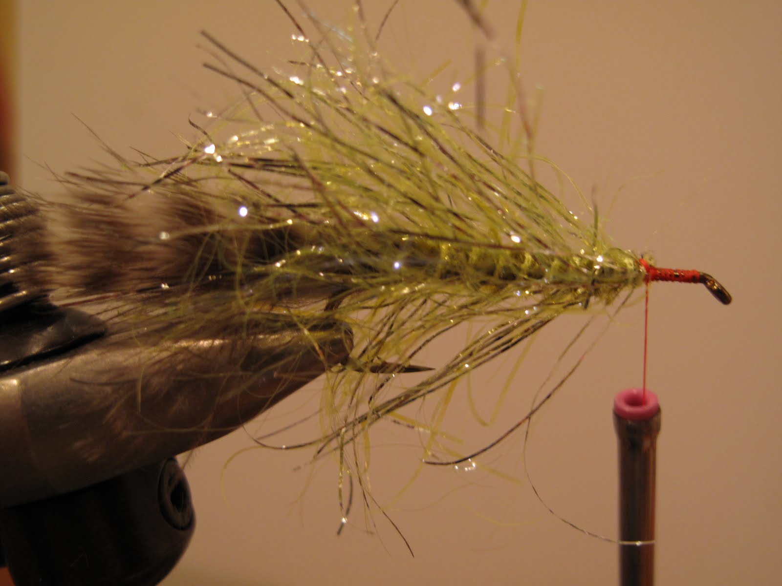 Small clump of ice dub, slide over hook eye so half in front of hook eye and half behind. Two wraps to tie in place, slide ice dub in front of hook eye back behind eye.